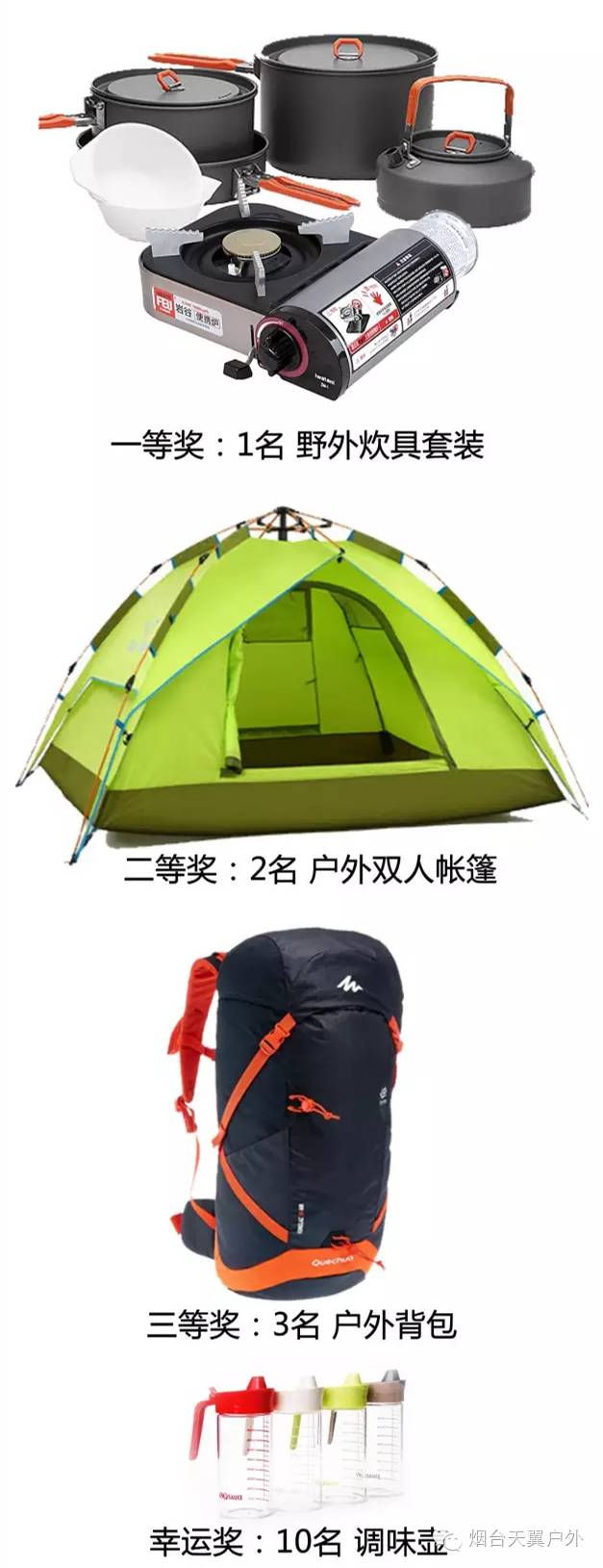 玩嗨了,过瘾了,还有终极幸运大抽奖!野外炊具套装、户外双人帐篷、户外登山包、调味壶等,全套户外装备背回家! 豪礼一重一重又一重,来天崮山,不虚此行!