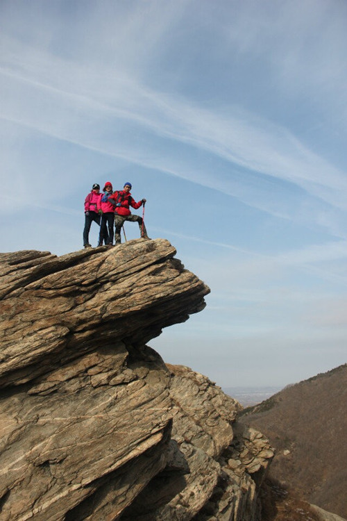 2015.1.7阳光明媚,约上几个刚认识的驴友一起挺进大磁山,来个磁山南北峰穿越探路,9:50到达,大家整理装备,10:00正式进军,刚开始还是愉快加轻松,等到了半山腰,那种感觉不言而喻,感觉呼吸都困难,心理有点想打退堂鼓了,但是又不好意思开口,看看几个女同志都能爬,坚持一定坚持,终不能落在女同志后面吧,哈哈,经过短暂调整,一股作气,直奔山顶,站在山顶有一种胜利的喜悦,对磁山的美色一览无余,尽情的呼吸,尽情的吼,举起双拳,尽情的宣泄压抑的心情,感觉真的很爽,我要飞,我要飞的更高。俗话说上山容易下山难,真的不假,哪里有路啊,全是悬崖陡壁,这些真的难不倒老驴友,经过他们不断的探路,终于找到下山的路,说实话,自己的腿都打颤了,路,陡峭不说,还有冰雪,好大的考验,在难走的地方,大家互相搀扶,作为领队,真的很细心,安全的照顾好每一个人,同时也感觉到小小团队的力量。经过不断的跋涉,终于安全到达山底,回头望去,哇,不敢想象这是我刚才下山的路吗,是,我可以战胜自己了,发觉爬山是一种生活态度、人生体验。把爬山当做一个小目标的话,爬到山顶,可以算作目标实现,而从山脚到山顶这一爬山的过程,便是一种体验。爬山很累,经常会汗流浃背。有的人坚持爬到上顶,在山顶的亭子里肆意享受凉风拂面、视野开阔的美好,有的人爬到半路,受不了身体受累而下山;有的人选择路程最长、跌宕起伏的爬山路径,而有的人选择一马平川的开阔路径;有的人爬山,风雨无阻,而有的人,在面临有雨的时候,会放弃爬山的打算。不同人的爬山的过程,折射出一个人的生活态度,在面临困难时,你如何抉择?你是迎难而上,执着于梦想或是目标的实现,还是畏惧不前,甚至中途退场;你是选择挑战,挑战自己的极限,追求更美好、更难忘的经历,还是选择平稳,将自己保护在安逸、稳定、安全的圈子中。你的选择,便是你的生活态度,不同的选择,便形成了不同的人生体验。这次真是一次美好的体验,生活对于我们总是充满激情和力量,在于我们不断地去探索和发现生活的乐趣和魅力,来吧朋友,2015,加油,加油!!!